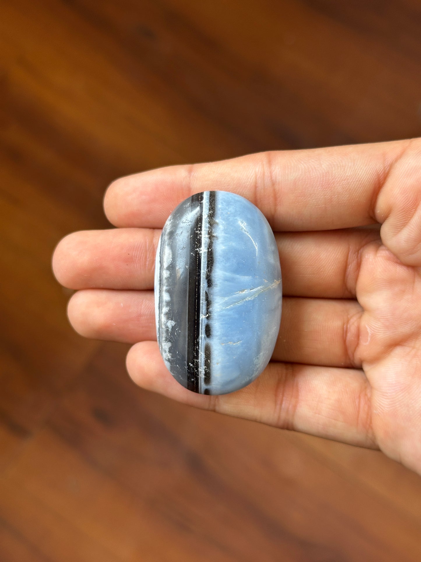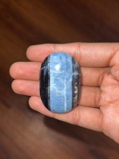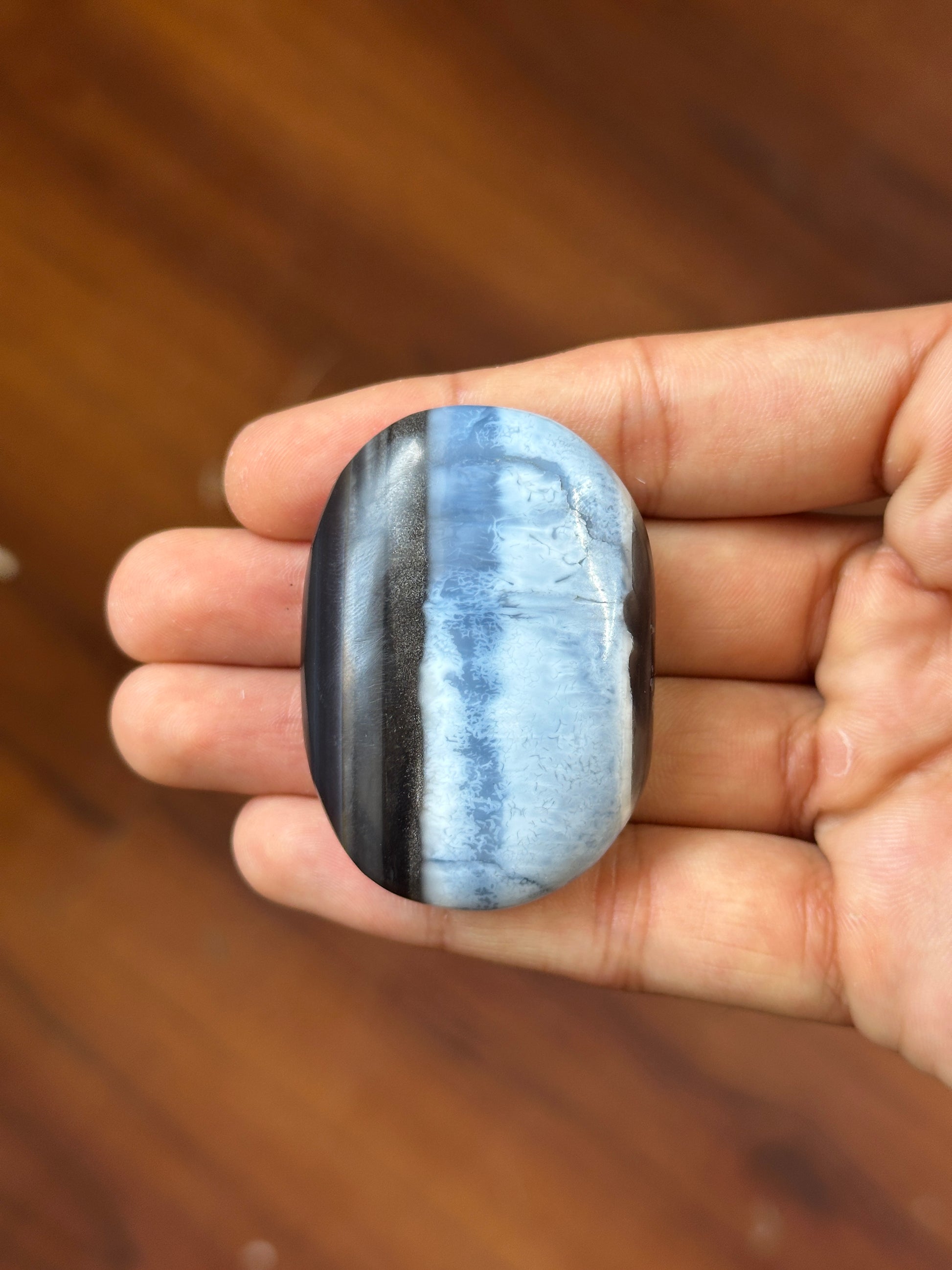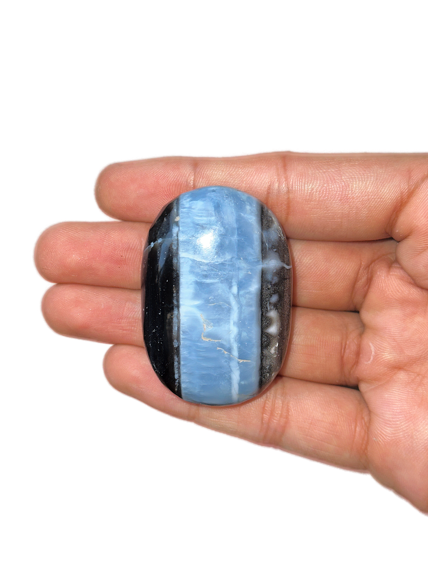These beautifully polished Blue Opal palmstones showcase a serene icy blue hue with gentle white and grey inclusions that create a dreamy, cloud-like effect. Although visually reminiscent of Owyhee Blue Opal from Oregon, known for its calming sky-blue tones, these particular stones are sourced from India, offering an equally stunning but more unique and globally sourced alternative.