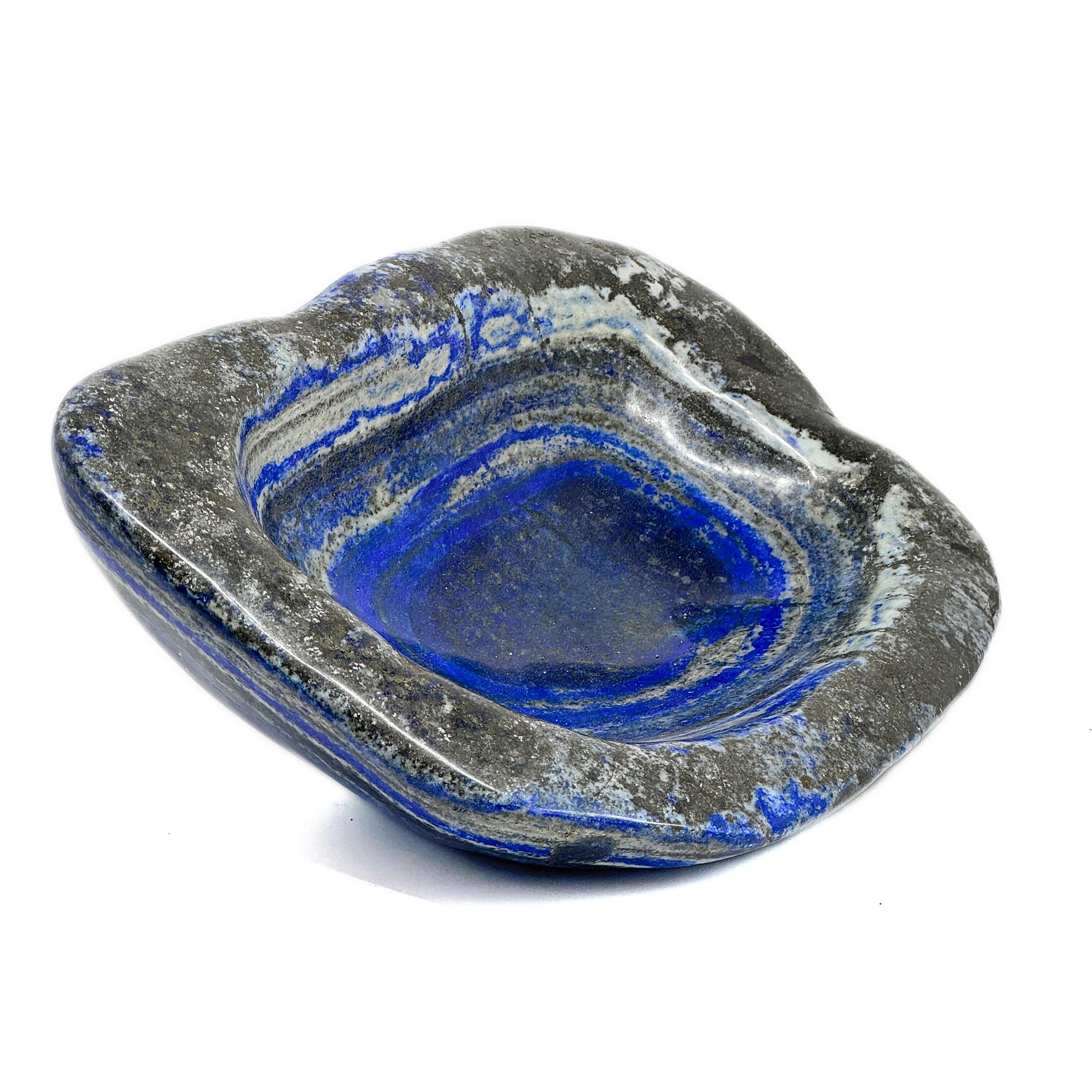 A hand-shaped lapis lazuli dish carved from a single block of stone. The form is wide and low, with softened edges and an organically sloped interior—made for display rather than precision symmetry.