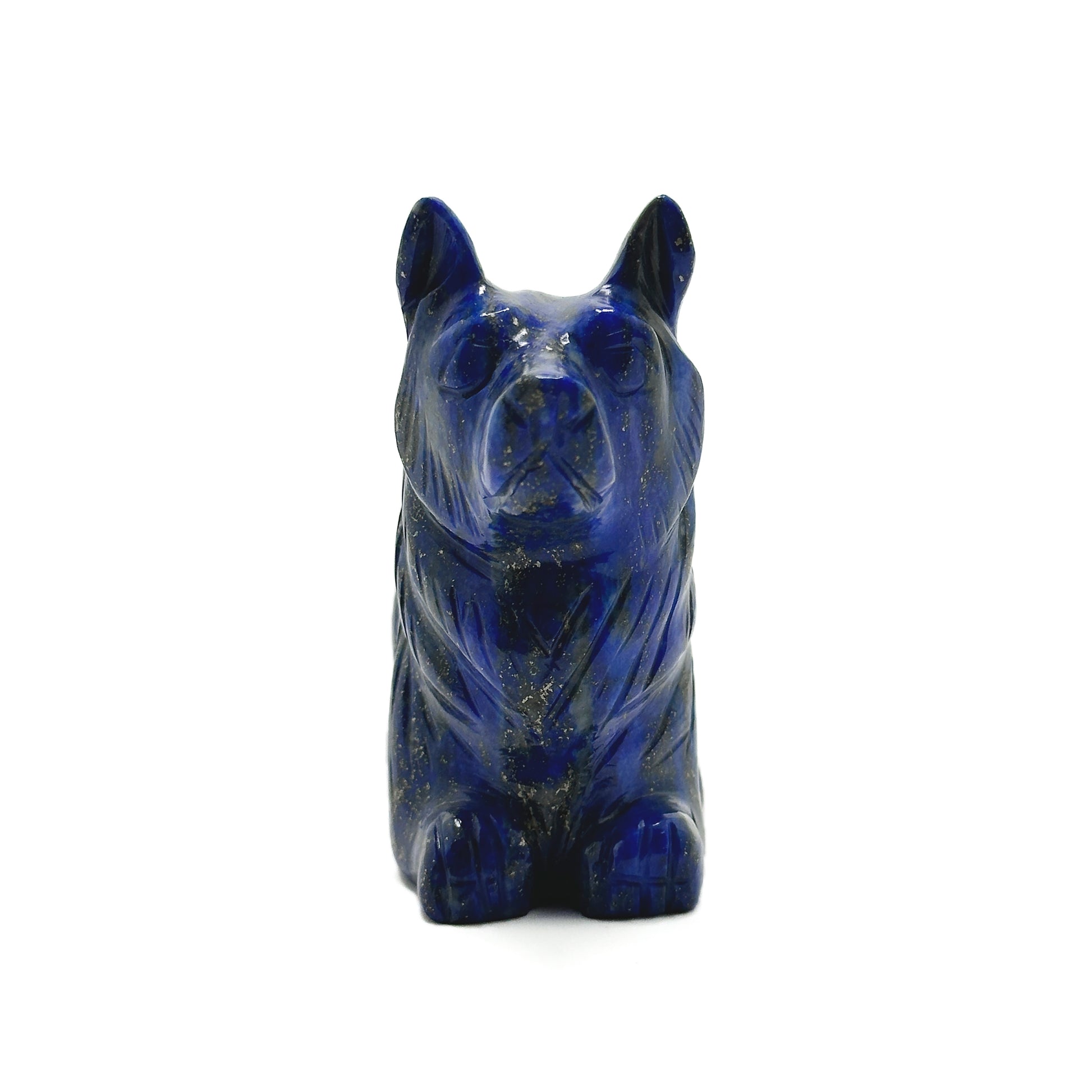 A hand-carved wolf figure made from natural lapis lazuli. The stone shows a rich ultramarine blue base, accented by fine pyrite flecks that create a subtle metallic sparkle when viewed up close. Soft grey veining breaks the surface in places, adding variation across the form.