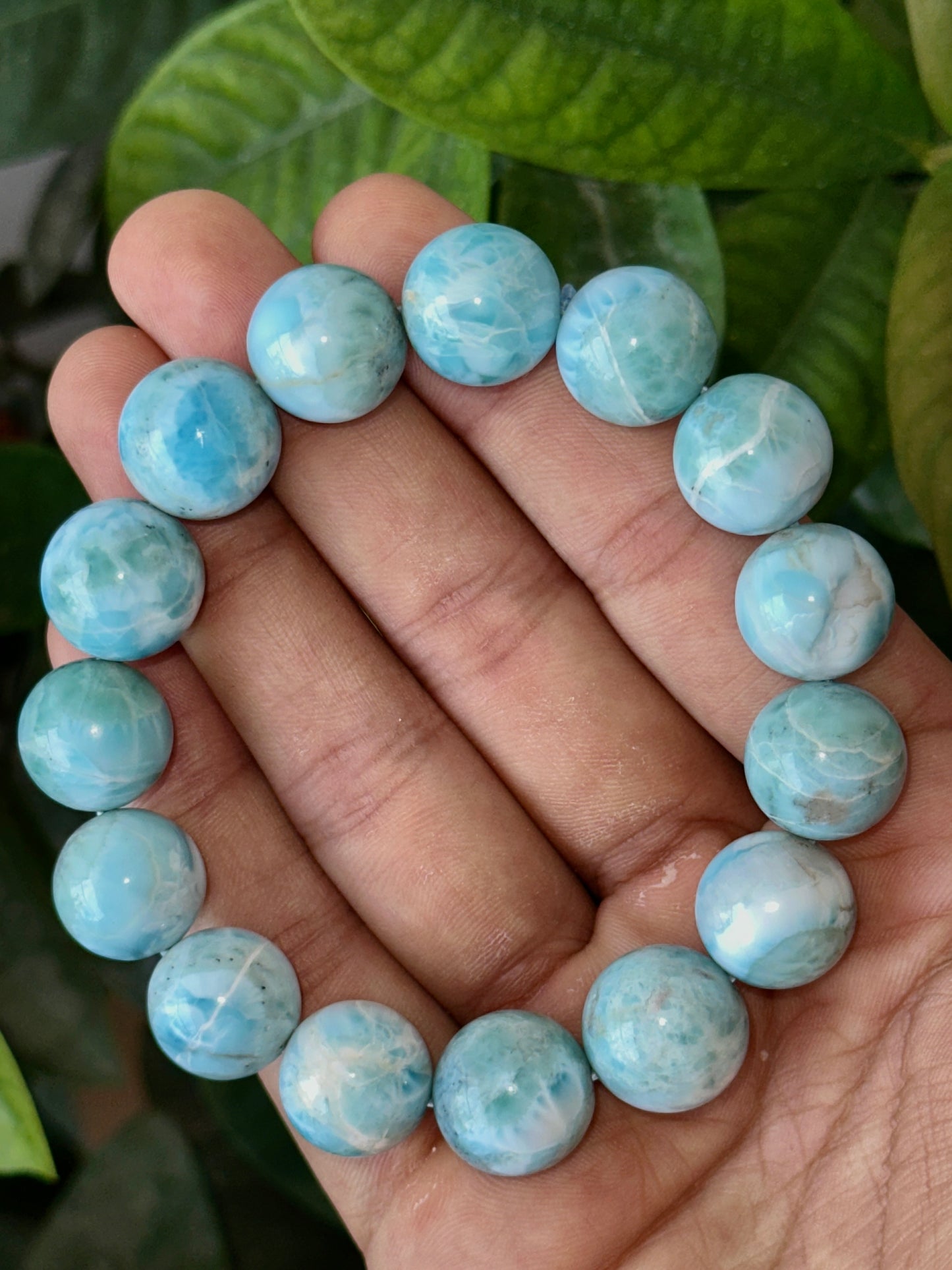This exquisite Larimar bracelet features hand-polished 12mm beads of rare, high-grade quality from the Dominican Republic — the only known source of this gemstone. Each bead carries the essence of tropical seas, showcasing a unique blend of sky blues, oceanic turquoise, and wispy white patterns that mimic Caribbean waves. Larimar is a stone of tranquility, believed to soothe emotions, dissolve stress, and connect one to the divine through the Throat Chakra.