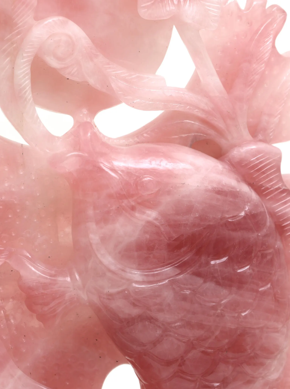 This intricately hand-carved Koi Fish and Lotus sculpture is created from a single piece of natural Rose Quartz, symbolizing love, harmony, and emotional balance. The carving captures a koi swimming gracefully amidst blooming lotuses — a traditional emblem of perseverance, beauty, and spiritual ascent.